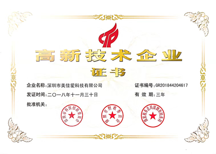 美佳愛科技高新技術企業認證證書